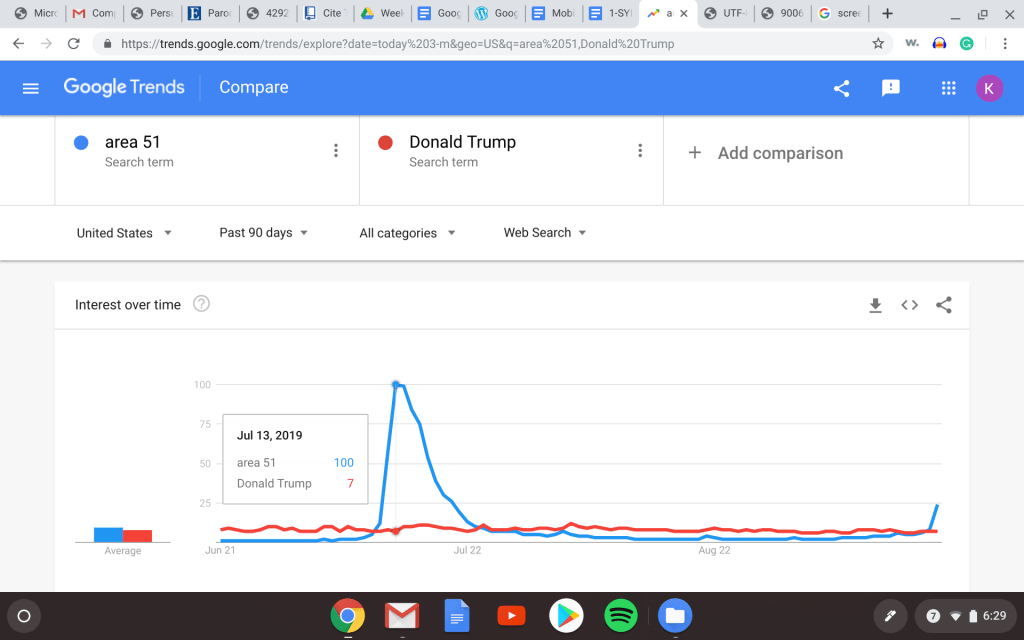 Area 51 is not normally a hot topic of conversation for many American citizens but that all seemed to change due to a sudden spike of interest in the location between July 11-13th 2019. What was the reason for this sudden spike in interest in a relatively secluded location? Actually, it was none other than a random Facebook event that turned into a gigantic internet meme. The event titled “Storm Area 51, They Can’t Stop All of Us” was created in an attempt to gather people to raid Area 51 in search of extraterrestrial life. The event seemed to blow up overnight, and at one time had over 2 million people who responded they were going, and 1.5 million interested in the event’s page. It had become the newest internet meme. The Facebook event took place on September 20th, 2019, which explains the sudden increase in area 51 again at the end of the trend graph.
