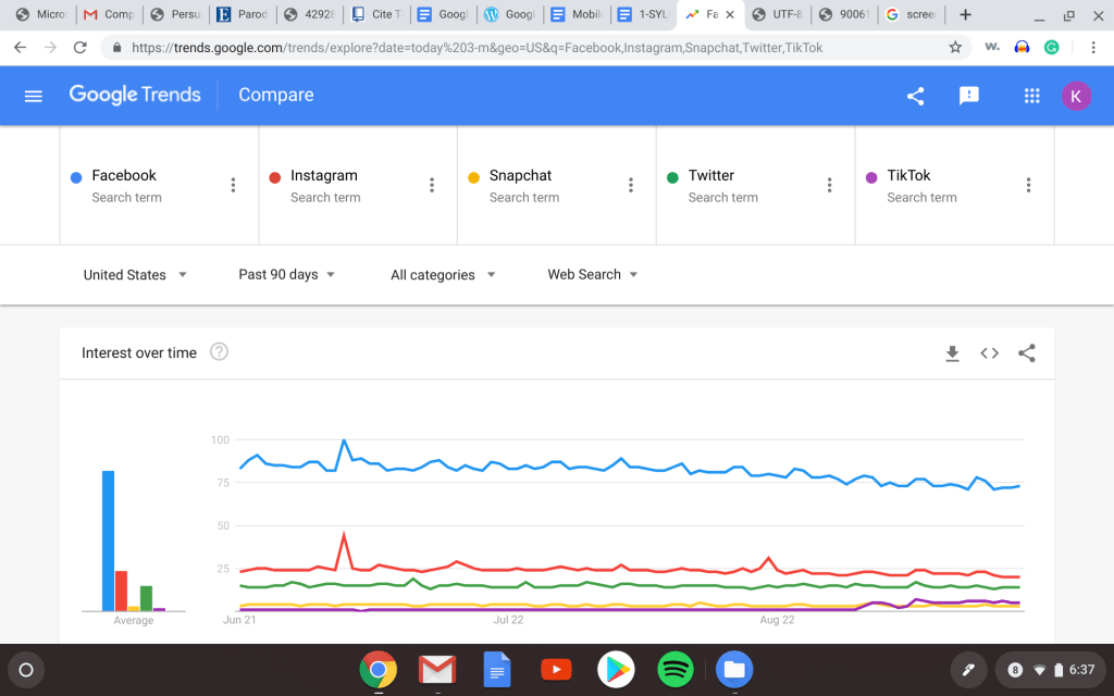 This figure also shows that interest in Snapchat has begun to fall below TikTok, which is a relatively new social media platform that has begun to gather some popularity. Snapchat was once thought to be the next big social media platform but interest in them seemed to hit a plateau and began to shrink after competitors released similar features such as Instagram Stories and Facebook Stories.